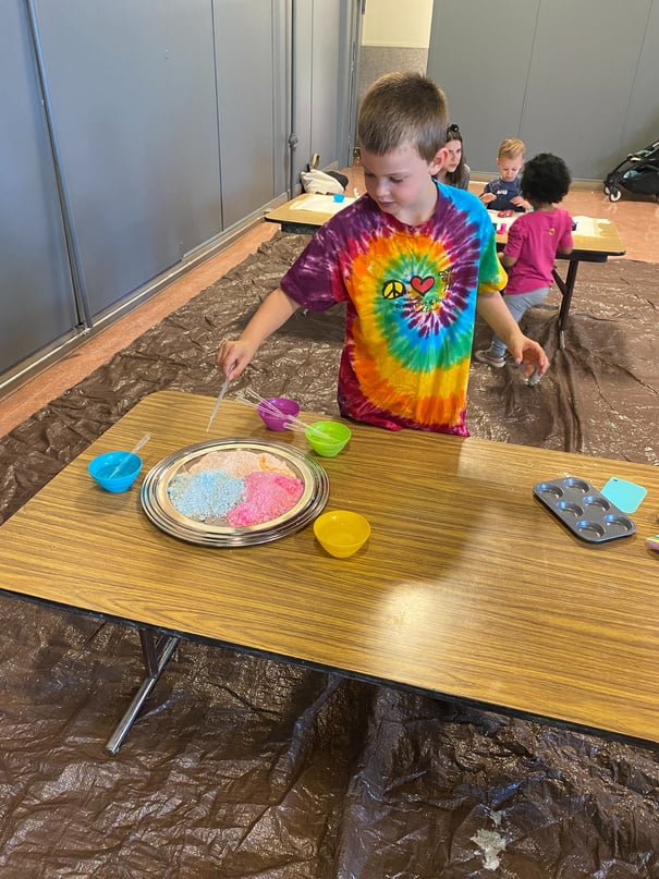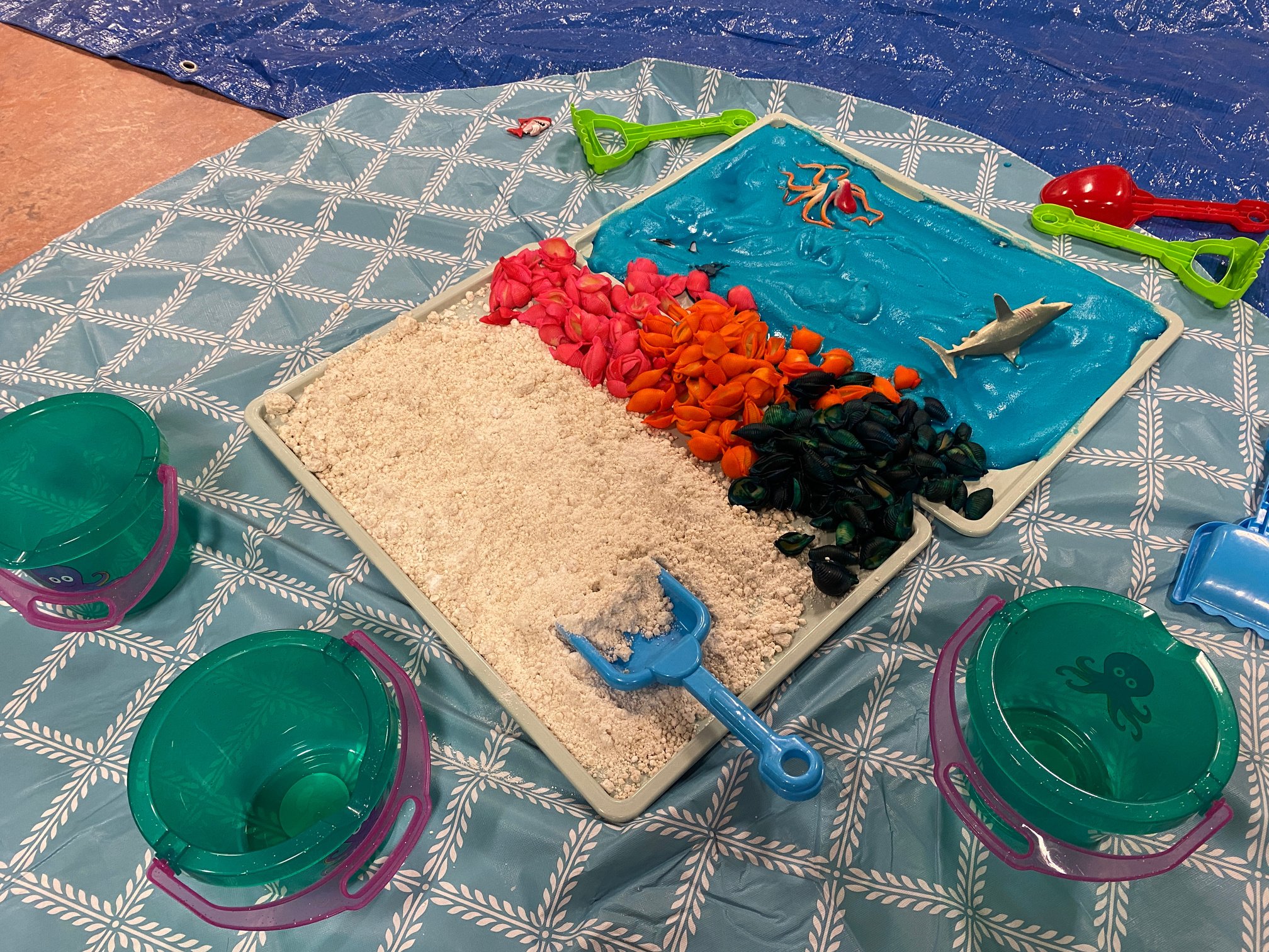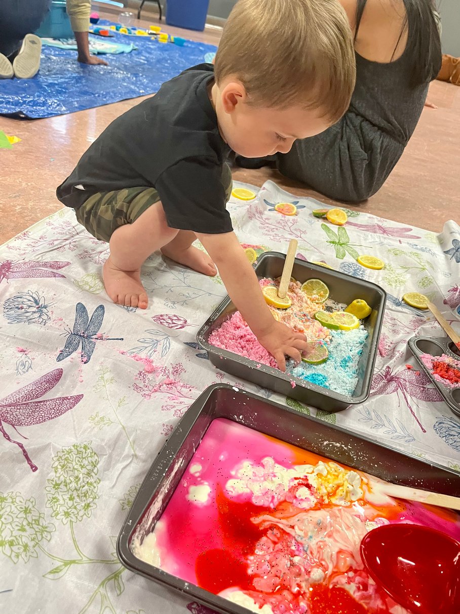 Child-led play allows children to explore their sense of self-direction and self-confidence. Messy play allows children to explore different materials with no set rules for how to play with the materials. In our messy play environment we encourage families to follow their children’s lead. This allows children to hold control over their world in a developmentally appropriate way.